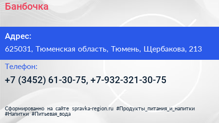 Банбочка по адресу 625031, Тюменская область, Тюмень, Щербакова, 213 в дальнейшем Организация, размещена в следующих категориях: