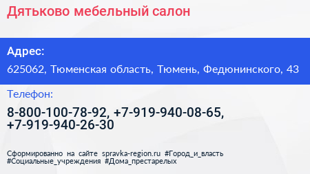 Дятьково, мебельный салон по адресу 625062, Тюменская область, Тюмень, Федюнинского, 43 в дальнейшем Организация, размещена в следующих категориях: