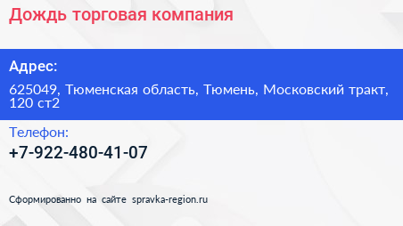Дождь, торговая компания по адресу 625049, Тюменская область, Тюмень, Московский тракт, 120 ст2 в дальнейшем Организация, размещена в следующих категориях: