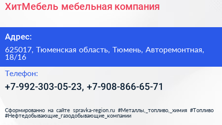 ХитМебель, мебельная компания по адресу 625017, Тюменская область, Тюмень, Авторемонтная, 18/16 в дальнейшем Организация, размещена в следующих категориях: