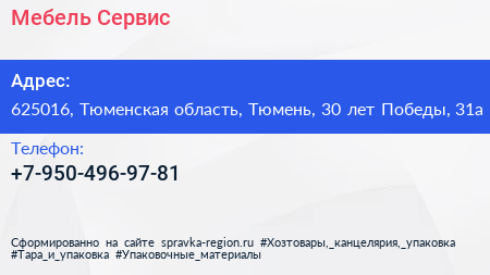 Мебель Сервис по адресу 625016, Тюменская область, Тюмень, 30 лет Победы, 31а в дальнейшем Организация, размещена в следующих категориях: