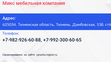 Микс, мебельная компания по адресу 625034, Тюменская область, Тюмень, Дамбовская, 53Б ст6 в дальнейшем Организация, размещена в следующих категориях: