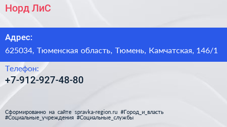 Норд-ЛиС по адресу 625034, Тюменская область, Тюмень, Камчатская, 146/1 в дальнейшем Организация, размещена в следующих категориях: