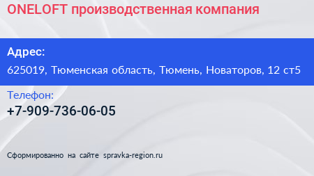 ONELOFT, производственная компания по адресу 625019, Тюменская область, Тюмень, Новаторов, 12 ст5 в дальнейшем Организация, размещена в следующих категориях: