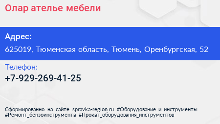 Олар, ателье мебели по адресу 625019, Тюменская область, Тюмень, Оренбургская, 52 в дальнейшем Организация, размещена в следующих категориях:
