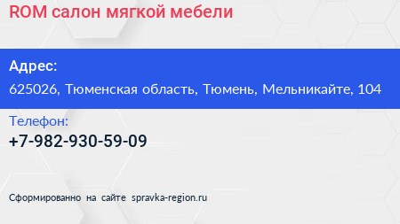ROM, салон мягкой мебели по адресу 625026, Тюменская область, Тюмень, Мельникайте, 104 в дальнейшем Организация, размещена в следующих категориях: