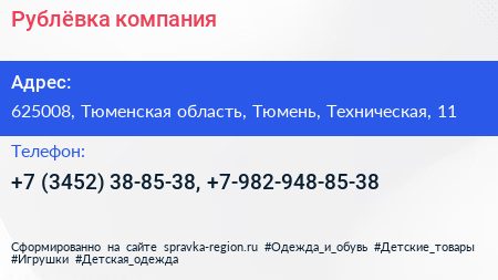 Для связи с организацией воспользуйтесь номером телефона: +7 (3452) 38-85-38, +7-982-948-85-38. Пн: c 09:00-21:00, Вт: c 09:00-21:00, Ср: c 09:00-21:00, Чт: c 09:00-21:00, Пт: c 09:00-21:00, Сб: c 09:00-21:00, Вс: выходной, вы можете обратиться в эту организацию.