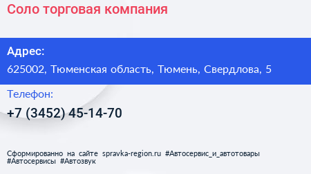 Соло, торговая компания по адресу 625002, Тюменская область, Тюмень, Свердлова, 5 в дальнейшем Организация, размещена в следующих категориях: