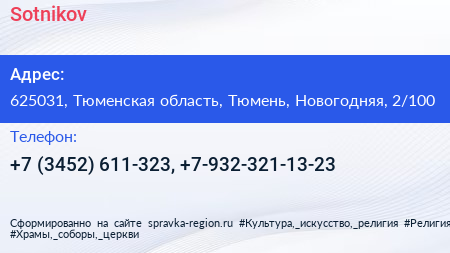 Sotnikov по адресу 625031, Тюменская область, Тюмень, Новогодняя, 2/100 в дальнейшем Организация, размещена в следующих категориях: