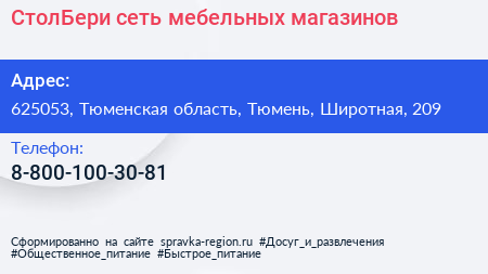 СтолБери, сеть мебельных магазинов по адресу 625053, Тюменская область, Тюмень, Широтная, 209 в дальнейшем Организация, размещена в следующих категориях: