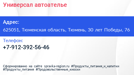 Универсал, автоателье по адресу 625051, Тюменская область, Тюмень, 30 лет Победы, 76 в дальнейшем Организация, размещена в следующих категориях: