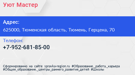 Уют Мастер по адресу 625000, Тюменская область, Тюмень, Герцена, 70 в дальнейшем Организация, размещена в следующих категориях: