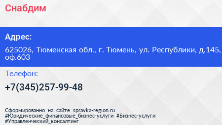 Снабдим по адресу 625026, Тюменская обл., г. Тюмень, ул. Республики, д.145, оф.603 в дальнейшем Организация, размещена в следующих категориях: