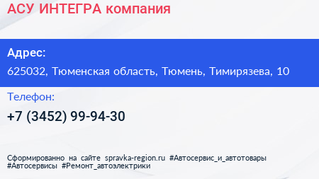 АСУ-ИНТЕГРА, компания по адресу 625032, Тюменская область, Тюмень, Тимирязева, 10 в дальнейшем Организация, размещена в следующих категориях: