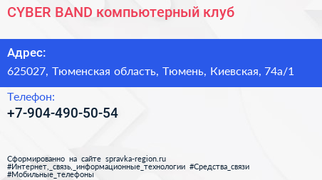 CYBER BAND, компьютерный клуб по адресу 625027, Тюменская область, Тюмень, Киевская, 74а/1 в дальнейшем Организация, размещена в следующих категориях: