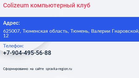 Colizeum, компьютерный клуб по адресу 625007, Тюменская область, Тюмень, Валерии Гнаровской, 12 в дальнейшем Организация, размещена в следующих категориях: