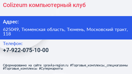 Colizeum, компьютерный клуб по адресу 625049, Тюменская область, Тюмень, Московский тракт, 118 в дальнейшем Организация, размещена в следующих категориях: