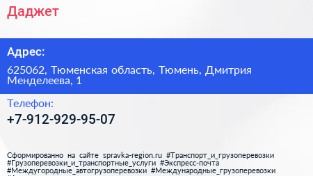 Даджет по адресу 625062, Тюменская область, Тюмень, Дмитрия Менделеева, 1 в дальнейшем Организация, размещена в следующих категориях: