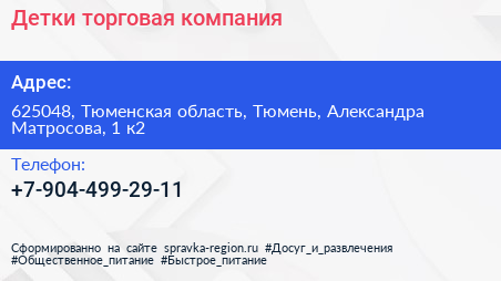 Детки, торговая компания по адресу 625048, Тюменская область, Тюмень, Александра Матросова, 1 к2 в дальнейшем Организация, размещена в следующих категориях: