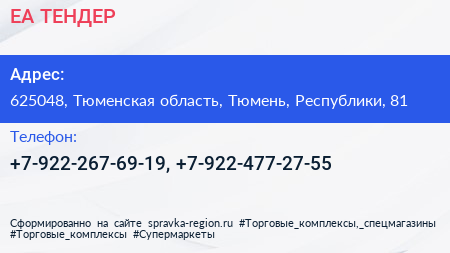 ЕА ТЕНДЕР по адресу 625048, Тюменская область, Тюмень, Республики, 81 в дальнейшем Организация, размещена в следующих категориях: