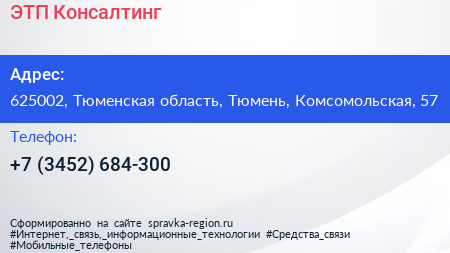 ЭТП-Консалтинг по адресу 625002, Тюменская область, Тюмень, Комсомольская, 57 в дальнейшем Организация, размещена в следующих категориях: