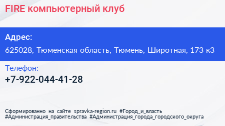 FIRE, компьютерный клуб по адресу 625028, Тюменская область, Тюмень, Широтная, 173 к3 в дальнейшем Организация, размещена в следующих категориях: