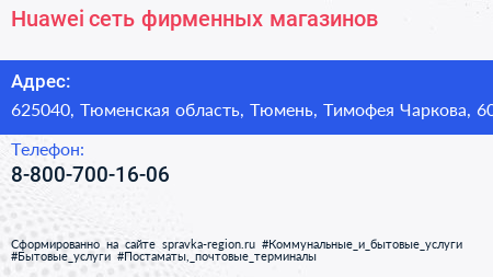 Huawei, сеть фирменных магазинов по адресу 625040, Тюменская область, Тюмень, Тимофея Чаркова, 60 в дальнейшем Организация, размещена в следующих категориях: