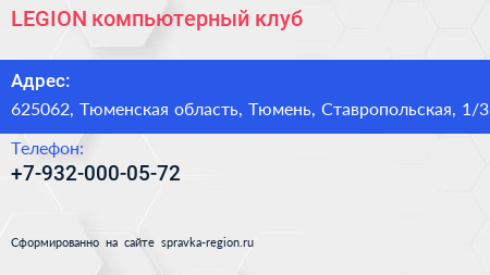 LEGION, компьютерный клуб по адресу 625062, Тюменская область, Тюмень, Ставропольская, 1/3 в дальнейшем Организация, размещена в следующих категориях: