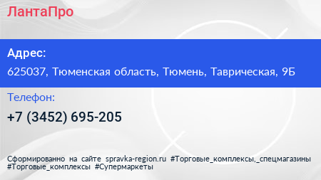 ЛантаПро по адресу 625037, Тюменская область, Тюмень, Таврическая, 9Б в дальнейшем Организация, размещена в следующих категориях: