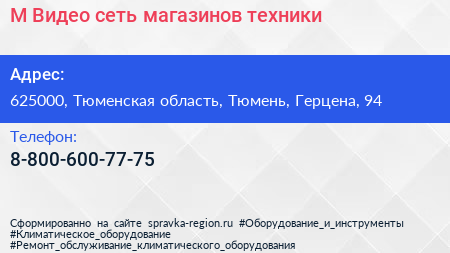 М.Видео, сеть магазинов техники по адресу 625000, Тюменская область, Тюмень, Герцена, 94 в дальнейшем Организация, размещена в следующих категориях: