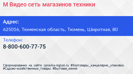 М.Видео, сеть магазинов техники по адресу 625016, Тюменская область, Тюмень, Широтная, 80 в дальнейшем Организация, размещена в следующих категориях: