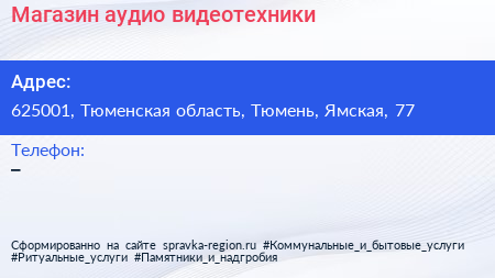 Магазин аудио-видеотехники по адресу 625001, Тюменская область, Тюмень, Ямская, 77 в дальнейшем Организация, размещена в следующих категориях: