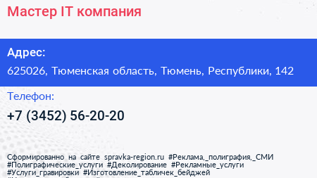 Мастер, IT-компания по адресу 625026, Тюменская область, Тюмень, Республики, 142 в дальнейшем Организация, размещена в следующих категориях: