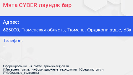 Мята CYBER, лаундж-бар по адресу 625000, Тюменская область, Тюмень, Орджоникидзе, 63а в дальнейшем Организация, размещена в следующих категориях: