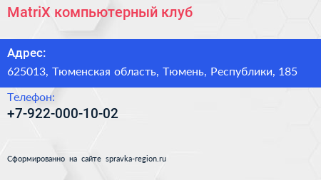 MatriX, компьютерный клуб по адресу 625013, Тюменская область, Тюмень, Республики, 185 в дальнейшем Организация, размещена в следующих категориях: