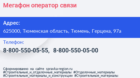 Мегафон, оператор связи по адресу 625000, Тюменская область, Тюмень, Герцена, 97а в дальнейшем Организация, размещена в следующих категориях: