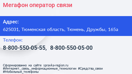 Мегафон, оператор связи по адресу 625031, Тюменская область, Тюмень, Дружбы, 165а в дальнейшем Организация, размещена в следующих категориях: