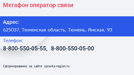 Мегафон, оператор связи по адресу 625037, Тюменская область, Тюмень, Ямская, 93 в дальнейшем Организация, размещена в следующих категориях: