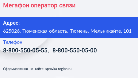 Мегафон, оператор связи по адресу 625026, Тюменская область, Тюмень, Мельникайте, 101 в дальнейшем Организация, размещена в следующих категориях: