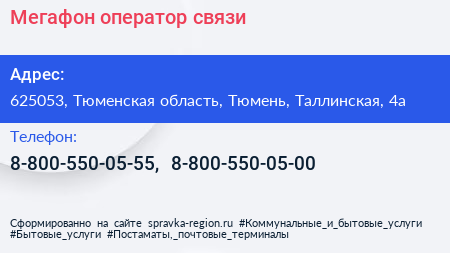 Мегафон, оператор связи по адресу 625053, Тюменская область, Тюмень, Таллинская, 4а в дальнейшем Организация, размещена в следующих категориях: