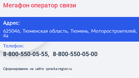Мегафон, оператор связи по адресу 625046, Тюменская область, Тюмень, Моторостроителей, 4а в дальнейшем Организация, размещена в следующих категориях: