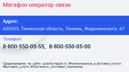 Мегафон, оператор связи по адресу 625033, Тюменская область, Тюмень, Федюнинского, 67 в дальнейшем Организация, размещена в следующих категориях: