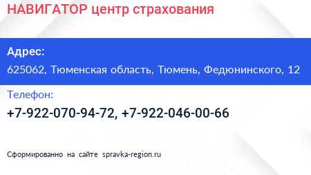 НАВИГАТОР, центр страхования по адресу 625062, Тюменская область, Тюмень, Федюнинского, 12 в дальнейшем Организация, размещена в следующих категориях: