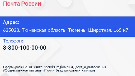 Почта России по адресу 625028, Тюменская область, Тюмень, Широтная, 165 к7 в дальнейшем Организация, размещена в следующих категориях: