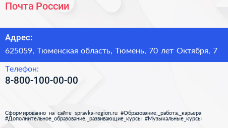 Почта России по адресу 625059, Тюменская область, Тюмень, 70 лет Октября, 7 в дальнейшем Организация, размещена в следующих категориях:
