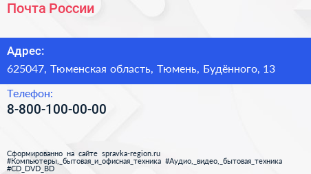 Почта России по адресу 625047, Тюменская область, Тюмень, Будённого, 13 в дальнейшем Организация, размещена в следующих категориях: