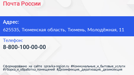 Почта России по адресу 625535, Тюменская область, Тюмень, Молодёжная, 11 в дальнейшем Организация, размещена в следующих категориях: