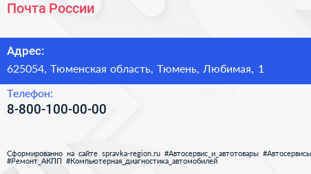 Почта России по адресу 625054, Тюменская область, Тюмень, Любимая, 1 в дальнейшем Организация, размещена в следующих категориях: