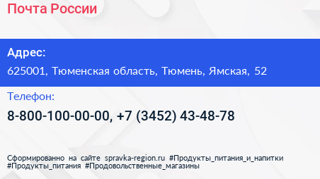 Почта России по адресу 625001, Тюменская область, Тюмень, Ямская, 52 в дальнейшем Организация, размещена в следующих категориях: