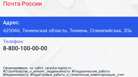Почта России по адресу 625046, Тюменская область, Тюмень, Олимпийская, 20а в дальнейшем Организация, размещена в следующих категориях: